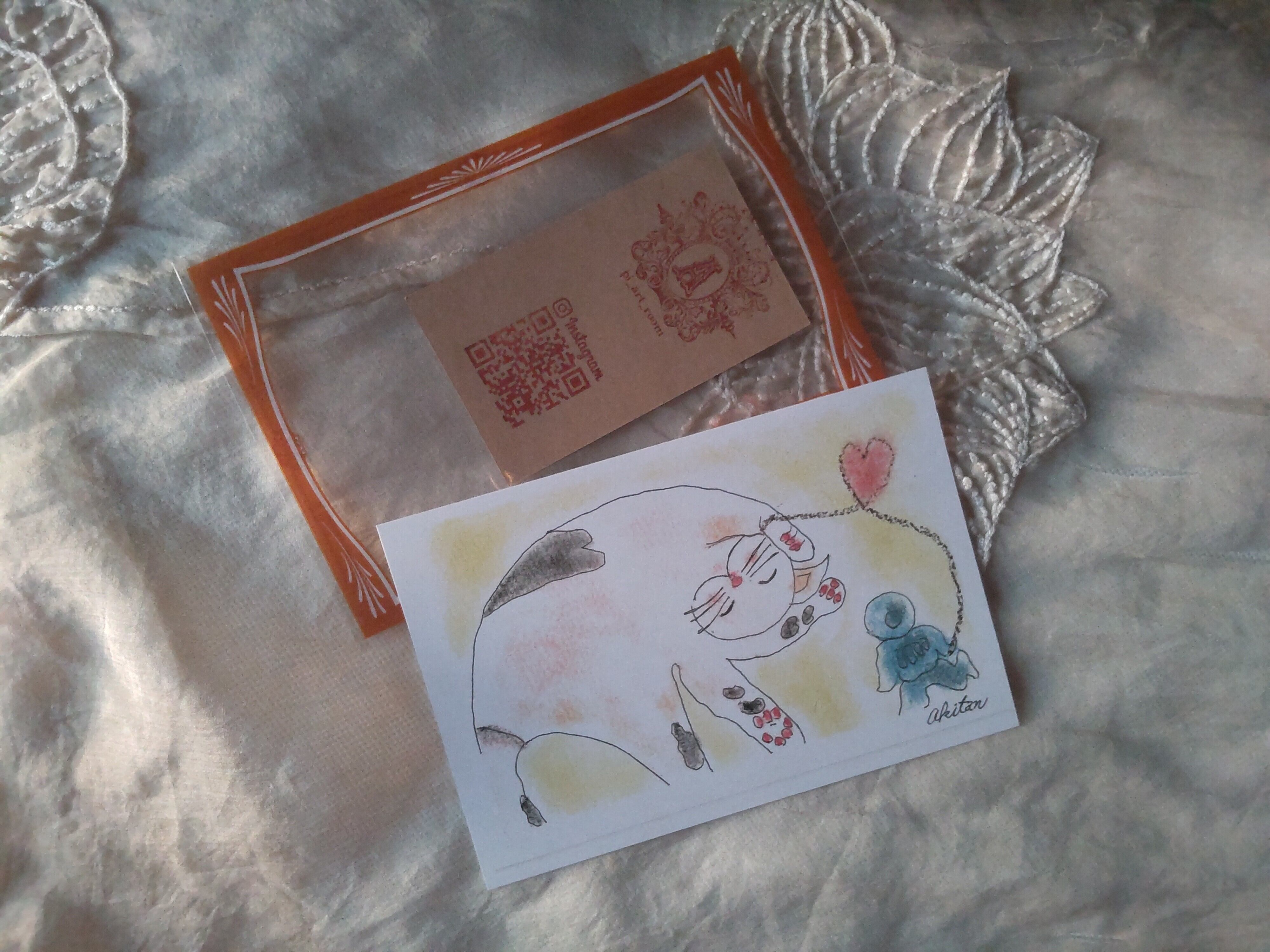 柔らかなパステルカラーで描かれた猫と宇宙人のコラボレーションが特徴です。フレンドリーでキュートなイラストは、お部屋のインテリアとして飾っても素敵です。友達へのメッセージや大切な人への想いを贈るのにぴったりな一枚です。