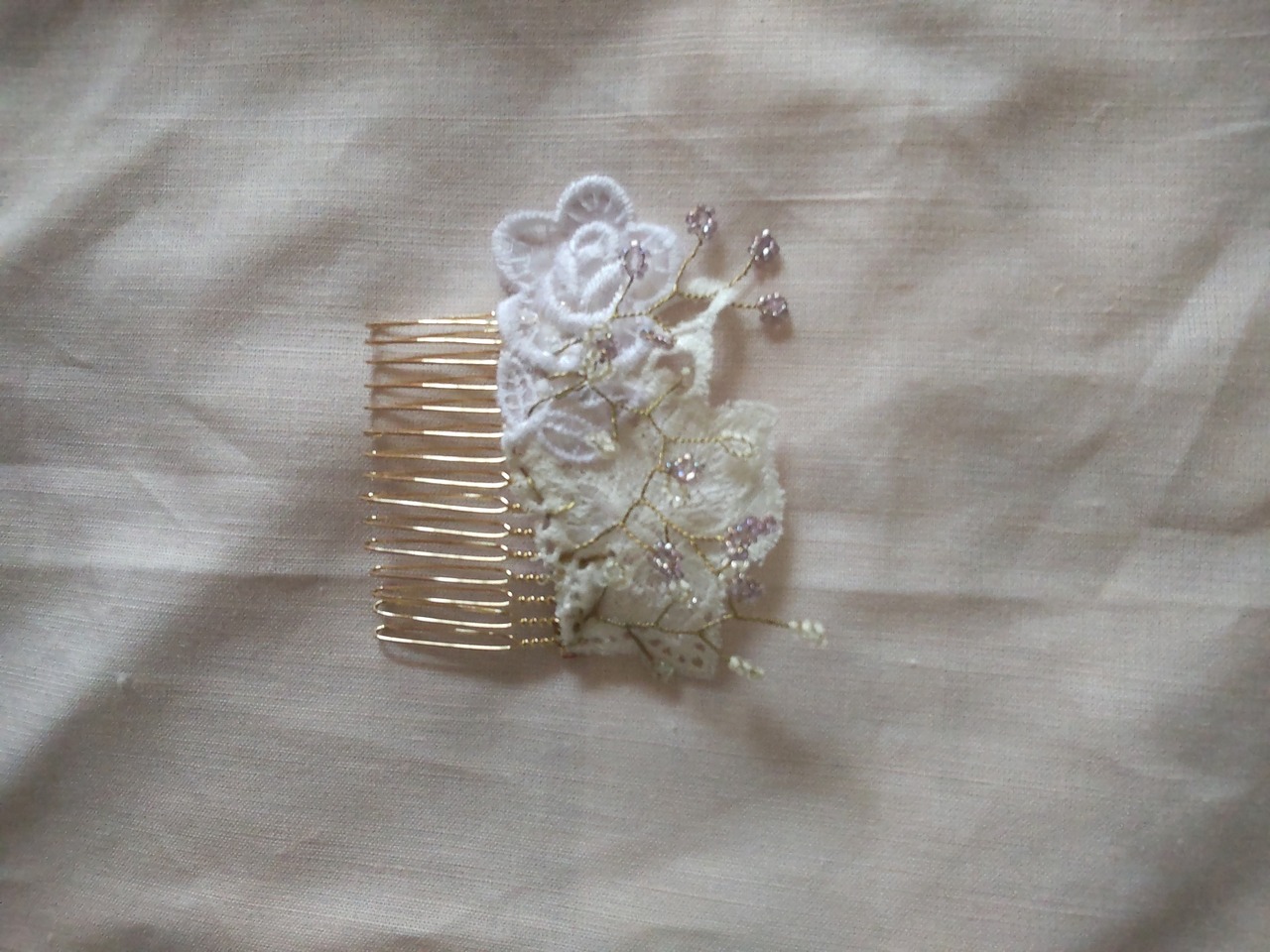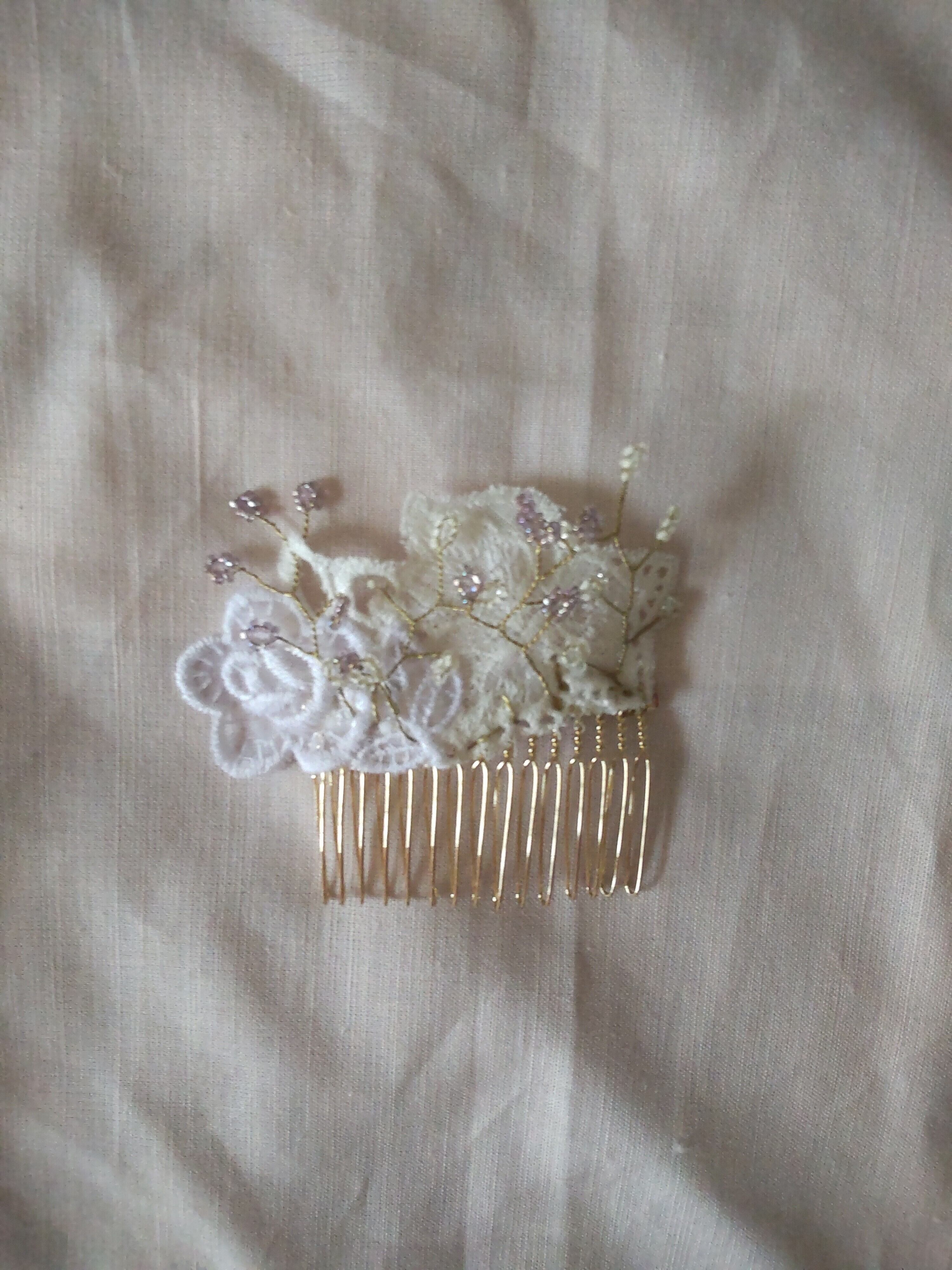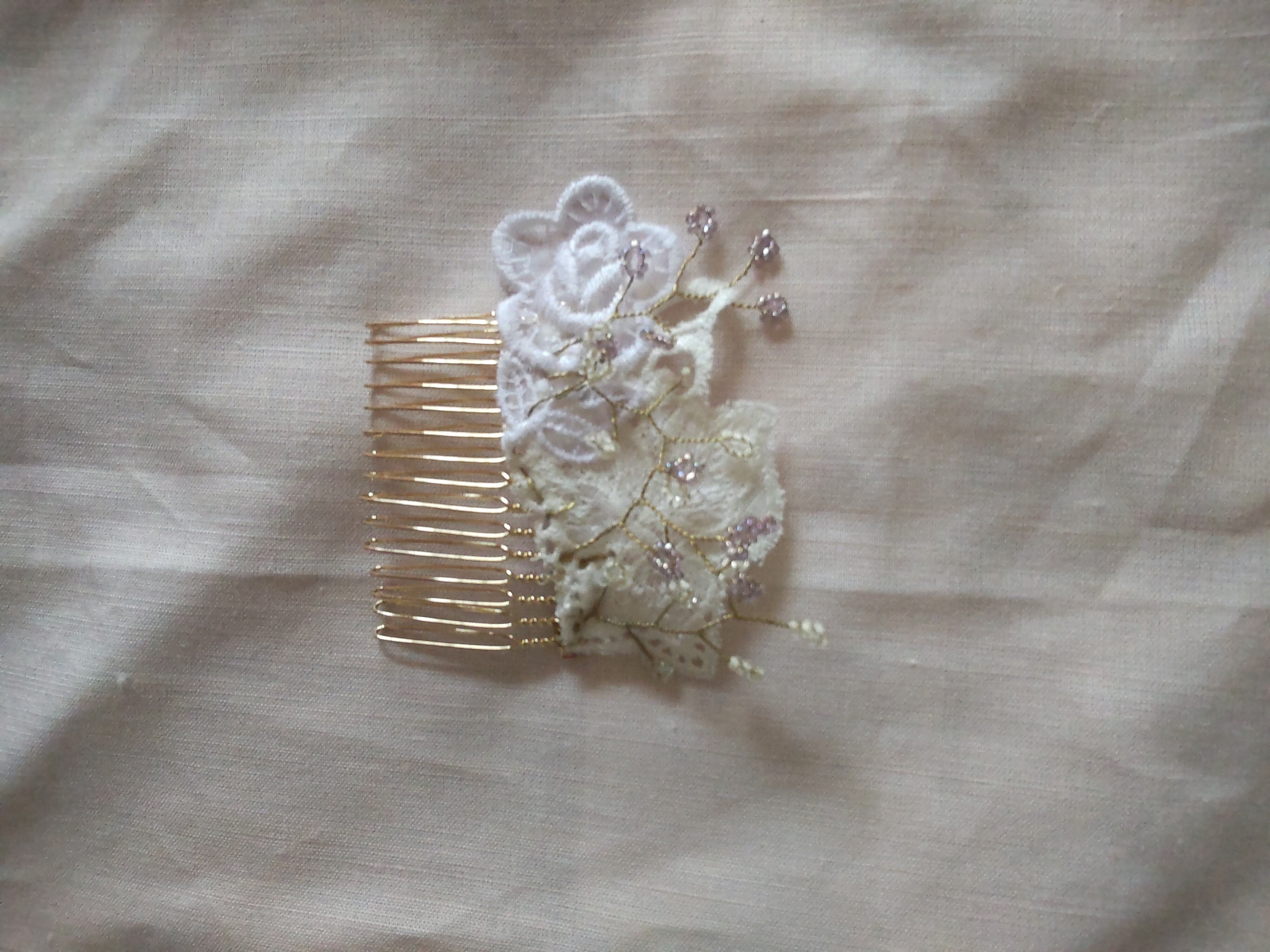ビーズと昭和の洋品店で購入した昭和レースを使用したシックな ヘアアクセサリーです。 ヘアコーム 昭和レトロ レース