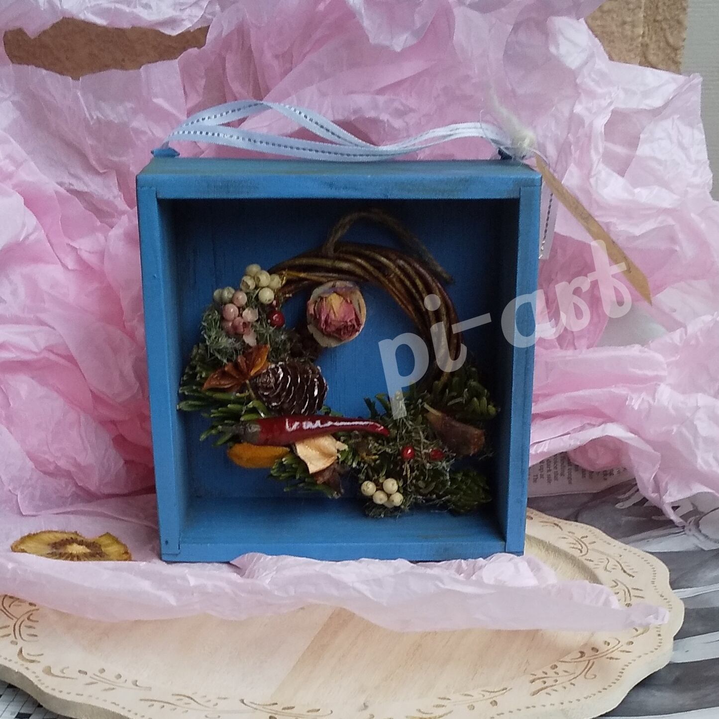 1#ミニリース付きブルー木箱とスワッグ、英字切り抜きぬきつき