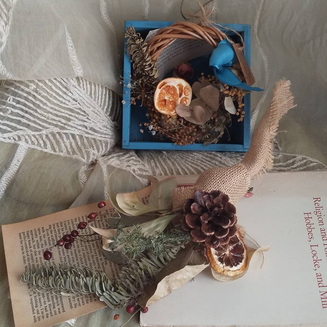 4#ミモザともみの木ドライリースブルー木箱スワッグつき