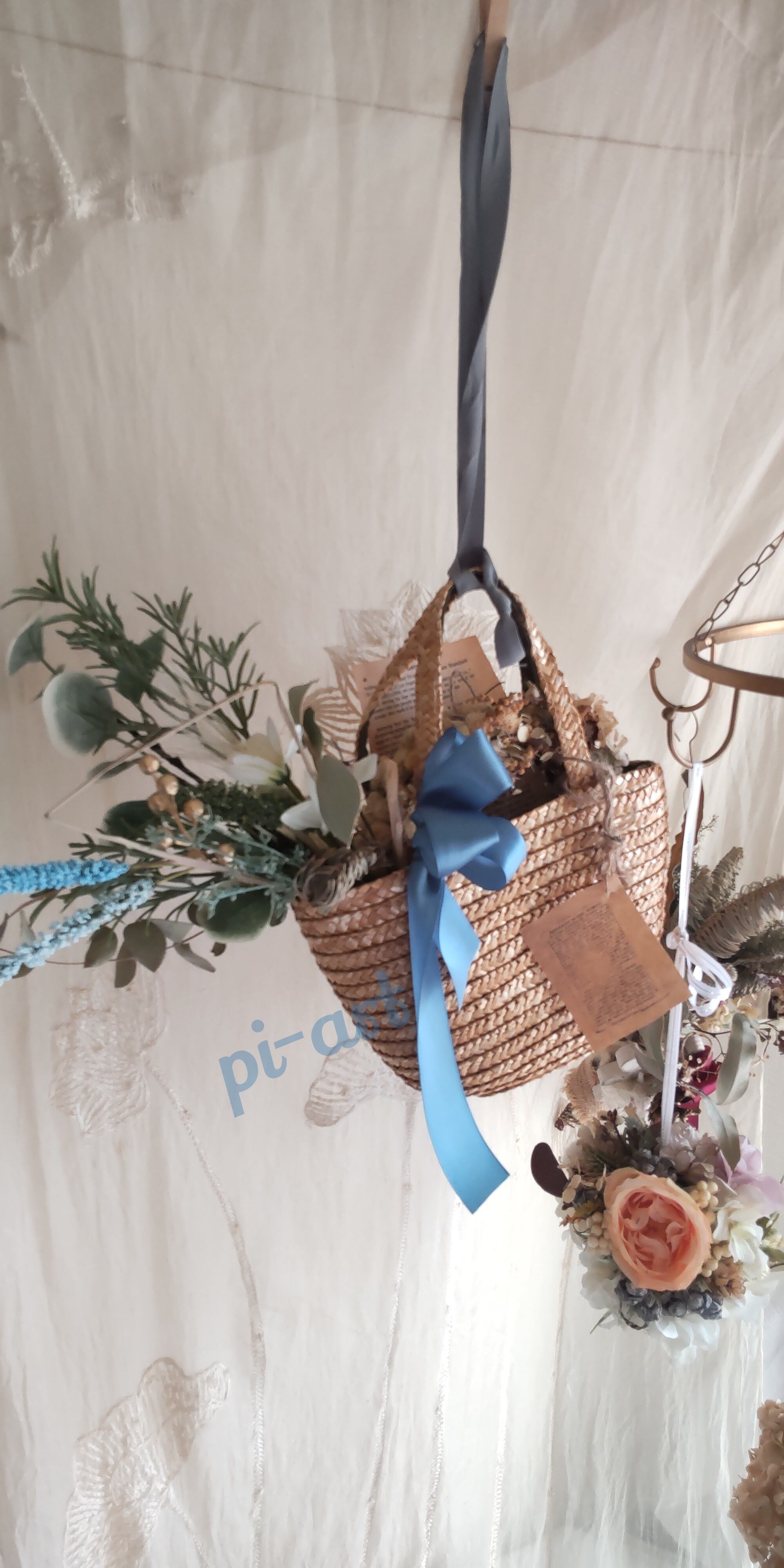ナチュラルリースと英字切り抜き 籠の詰め合わせアレンジメント