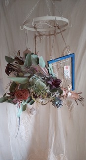 【234】ミモザいり ナチュラルなプロテア ピンクッションスワッグ、青いフレームつき