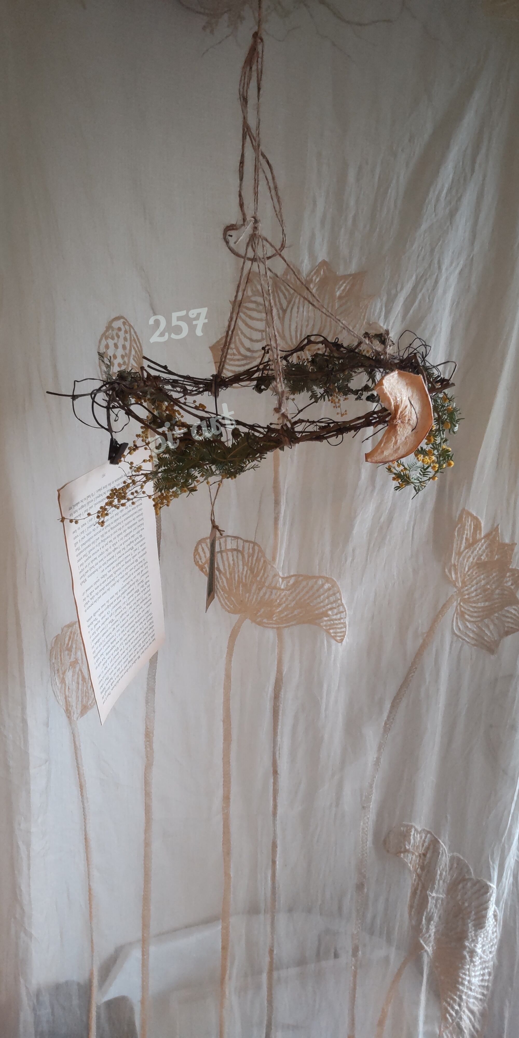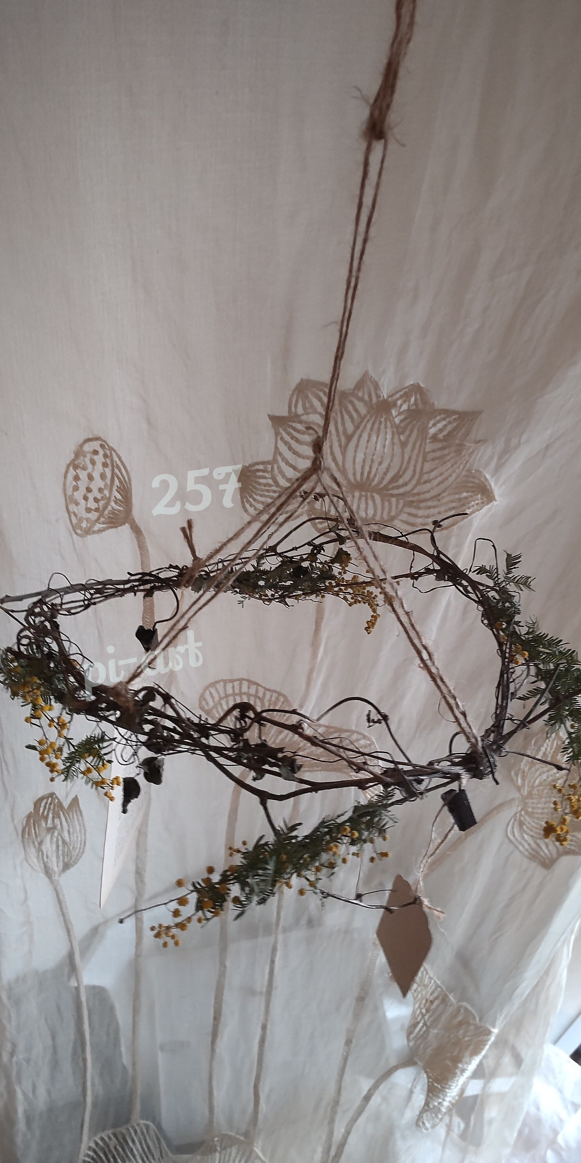 蔦に麻紐を巻き付けミモザと絡めました。自家製ドライフルーツのりんごとともに軽量ざっくりとしたフライングリースです