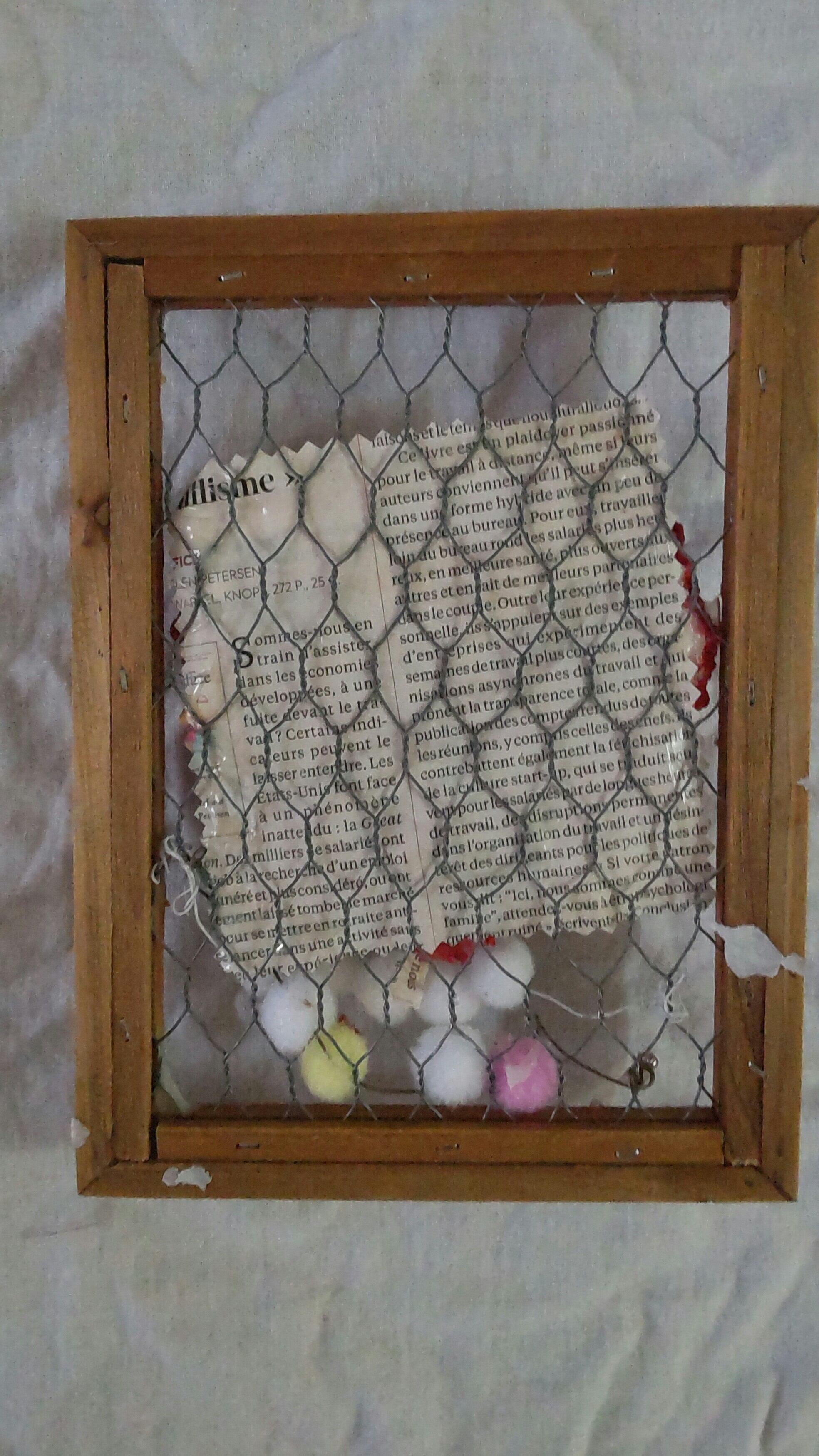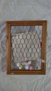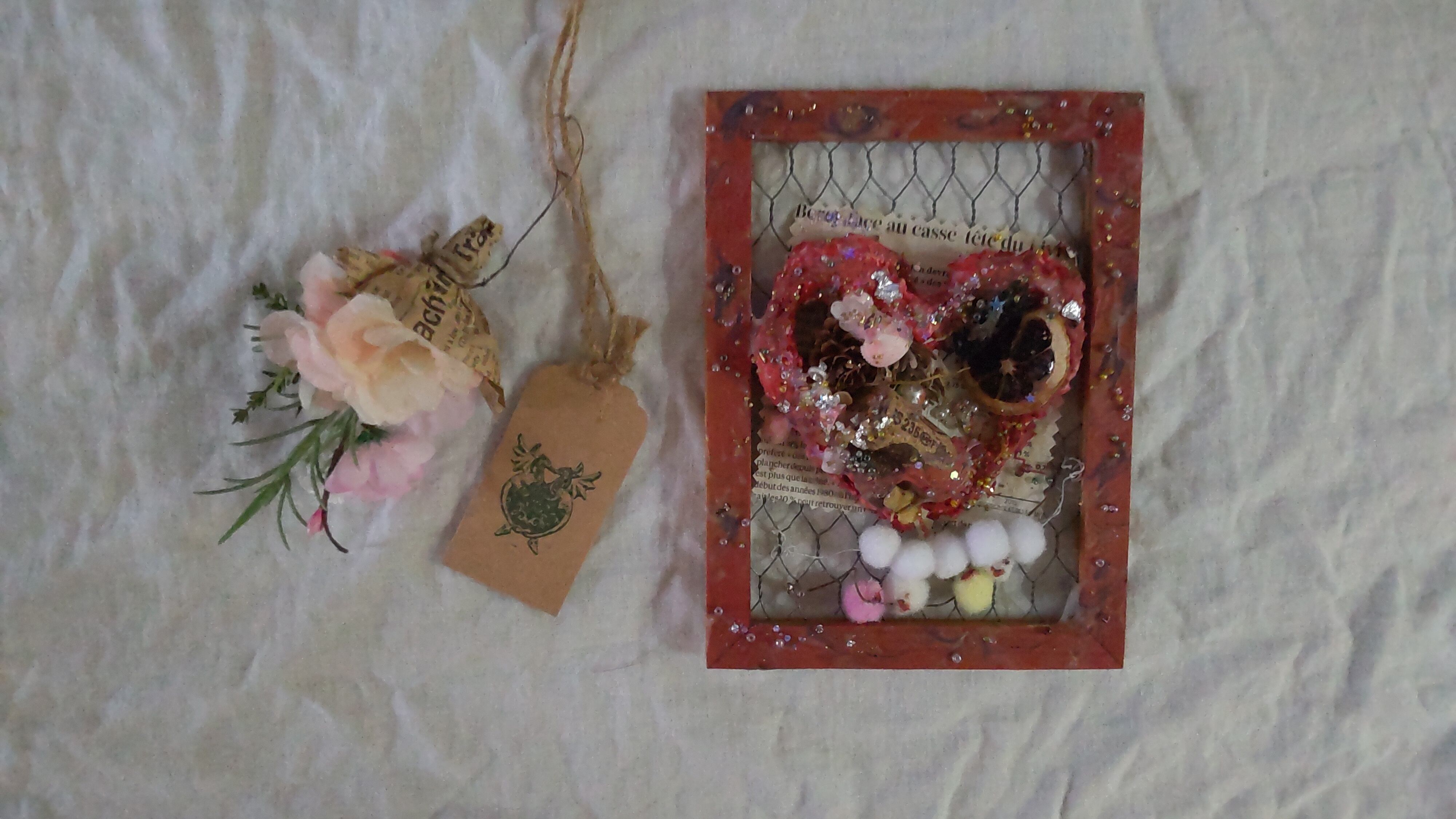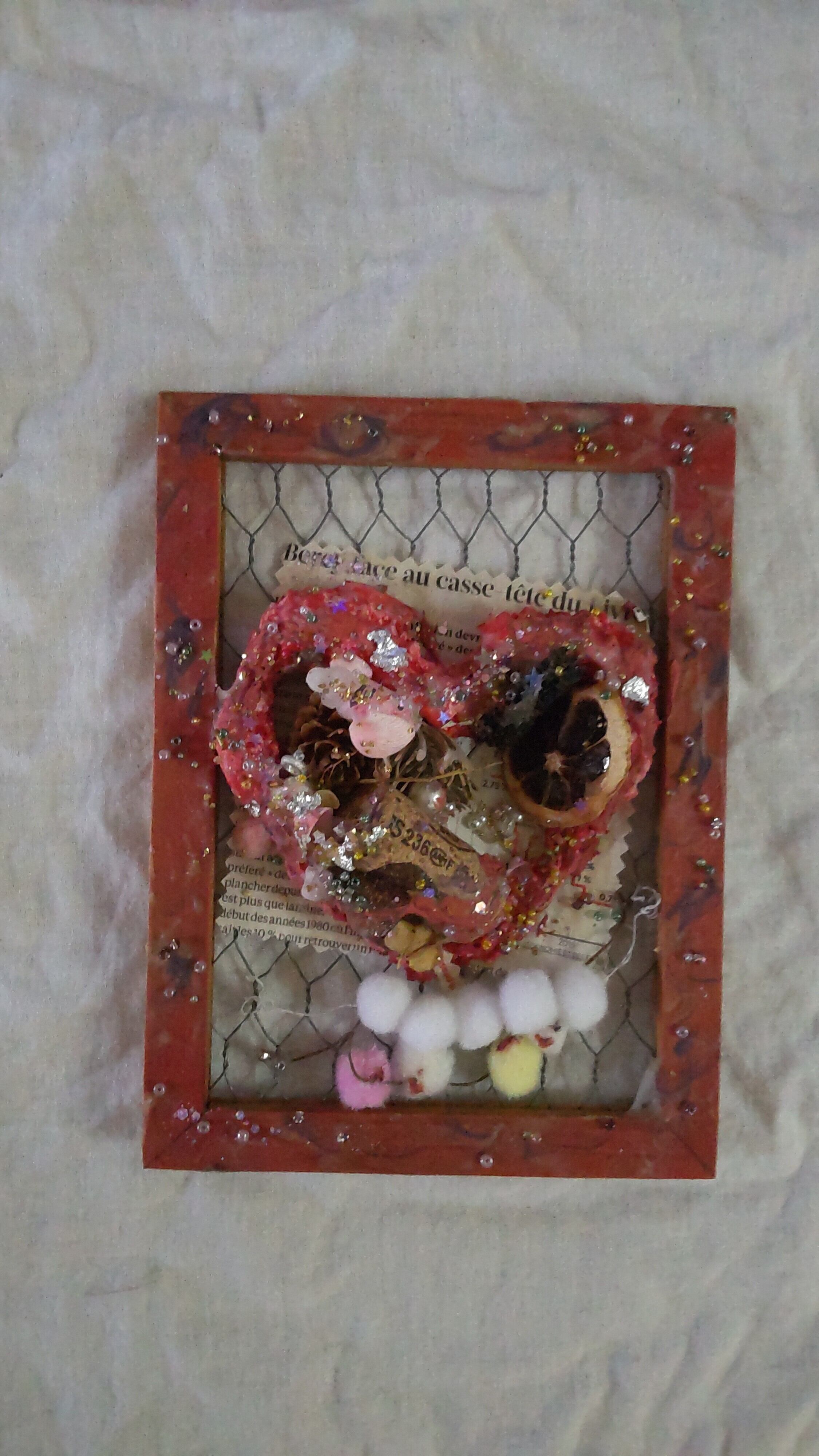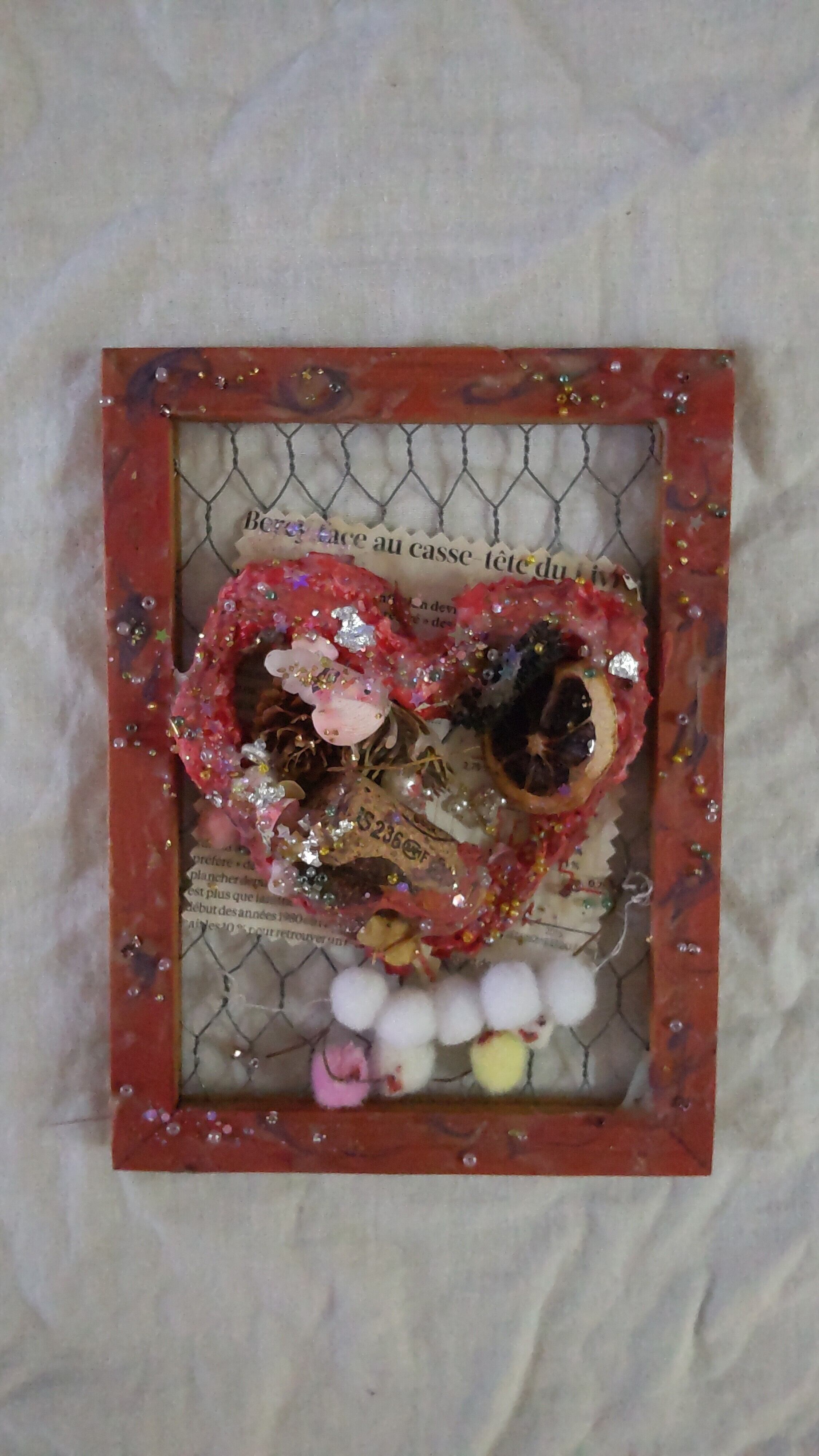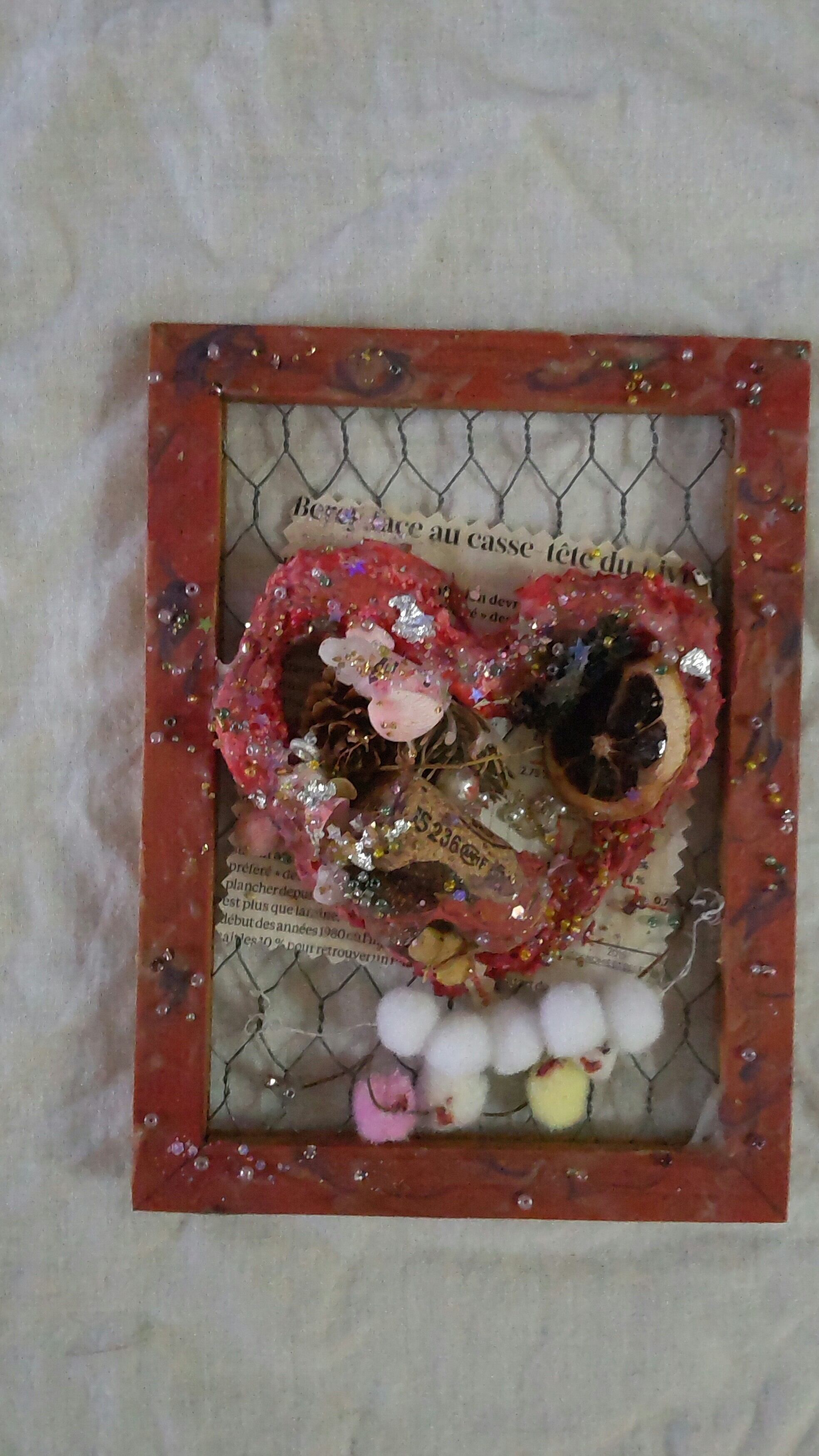 くすんだ赤縁の金網とハートのミクストメディアのジャンクアート作品です。